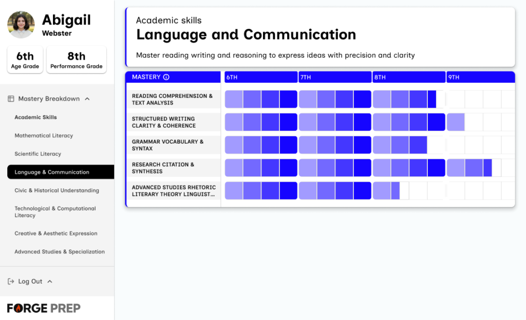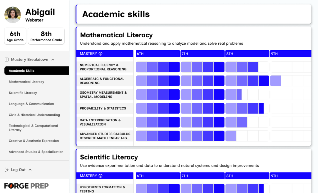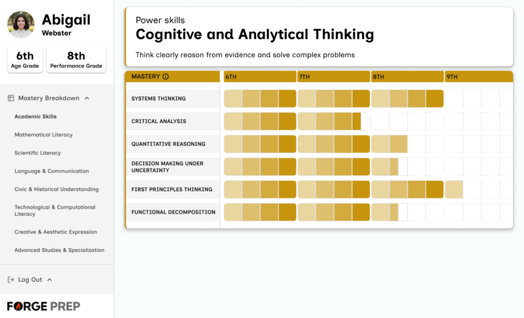 Notice Abigail’s transcript shows her age grade (6th) and performance grade (8th). She’s working two years ahead in multiple domains.