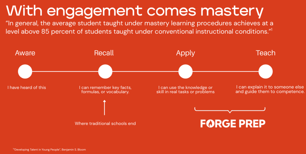 At Forge, we think of these on a continuum with mastery being the goal and being demonstrable through application and/or teaching.