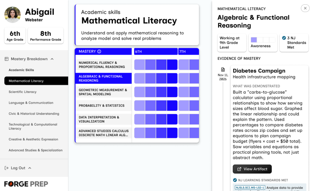 When a student lights up “Persuasive Communication,” you click “View Artifact” and see their presentation to a small business or their pitch to city council. You don’t see a grade or a teacher’s description of their work. You see the actual work.