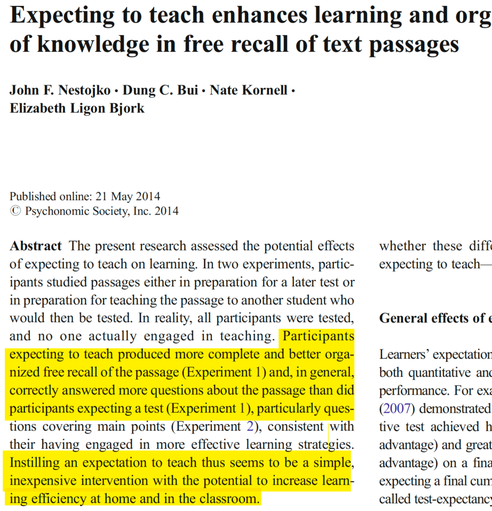 And research confirms this: students who prepare to teach process information more effectively than students preparing for a test. They focus on main points, organize information coherently, and retain more. Teaching isn’t just proof of mastery. Preparing to teach actually creates deeper mastery.